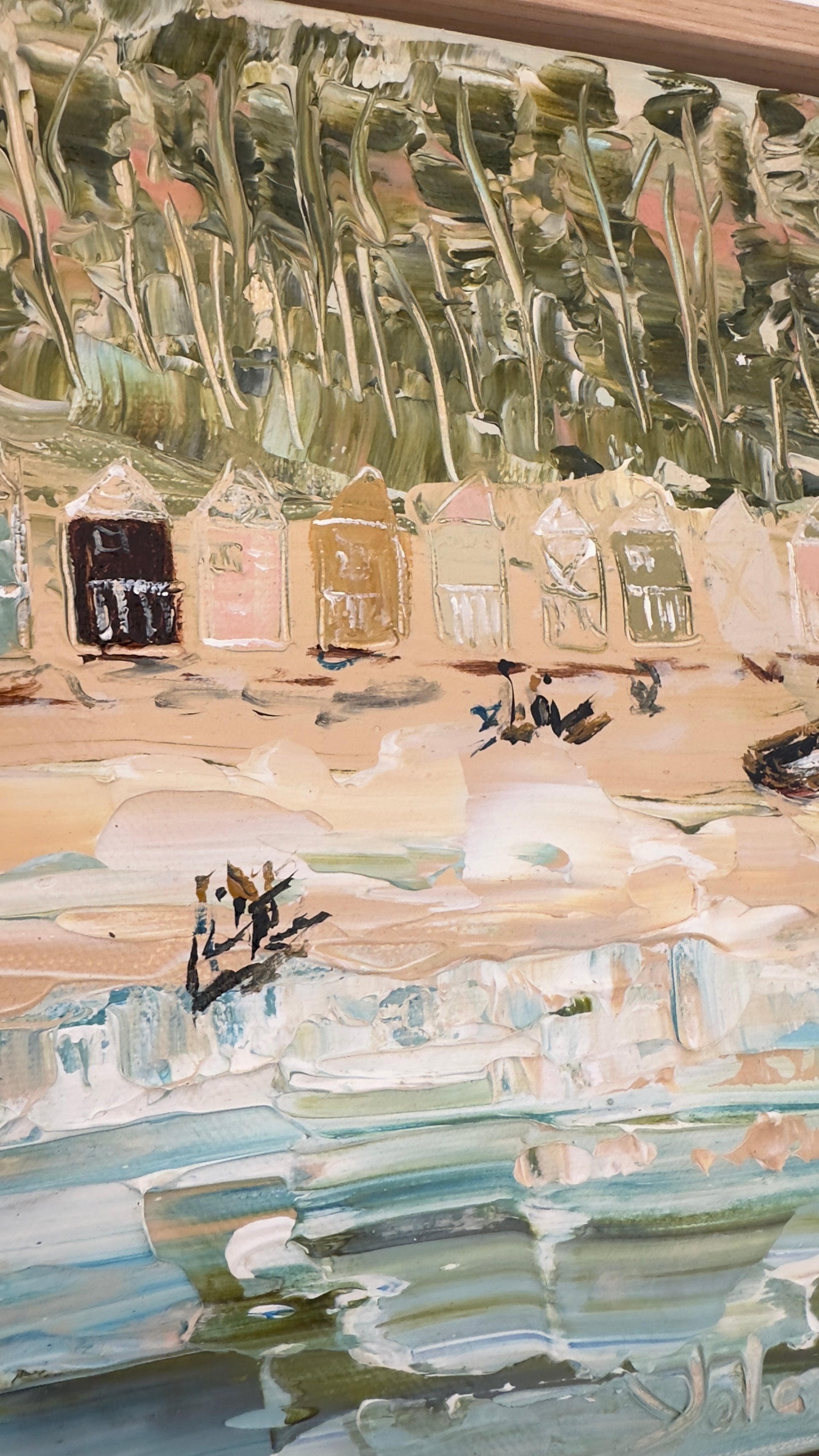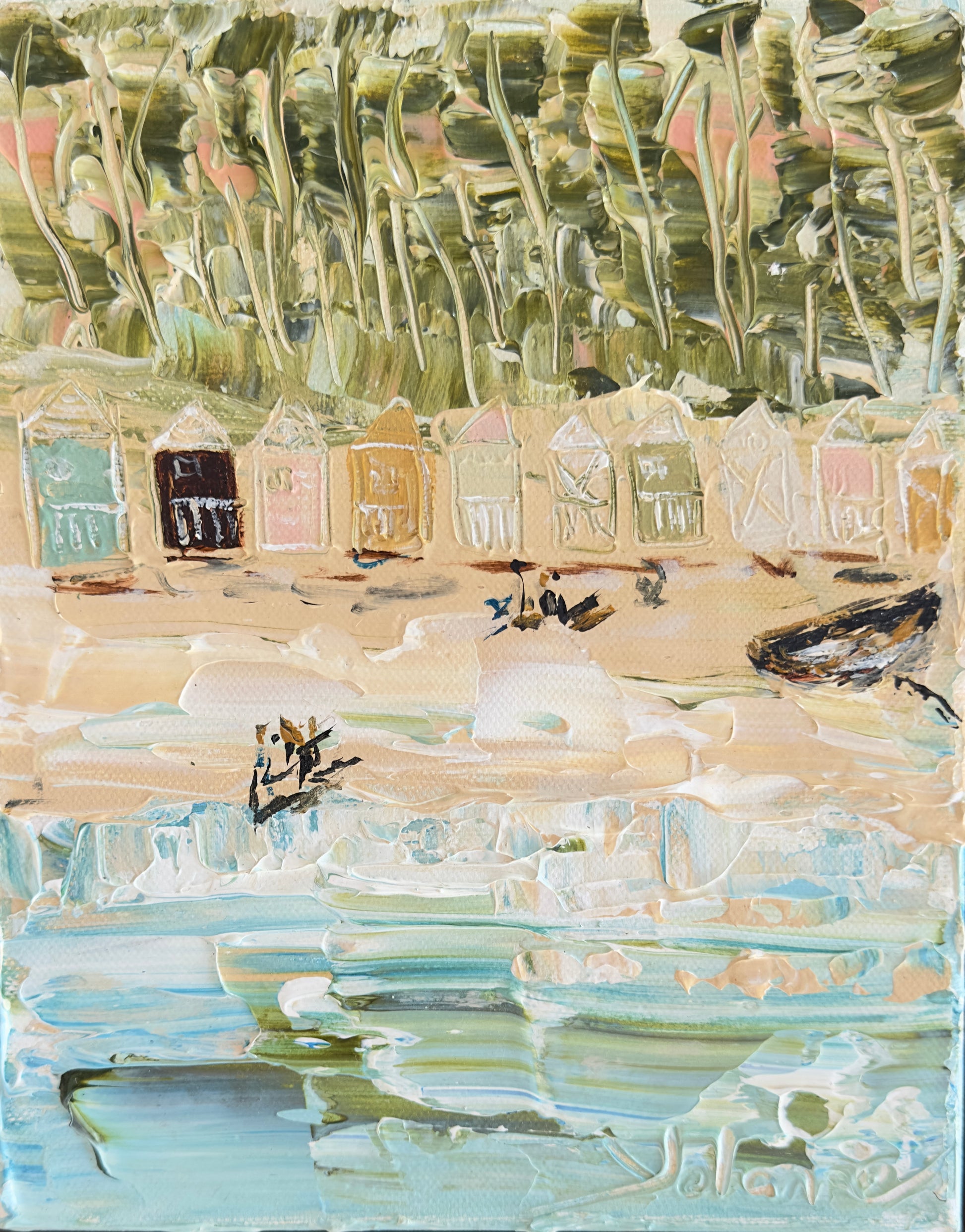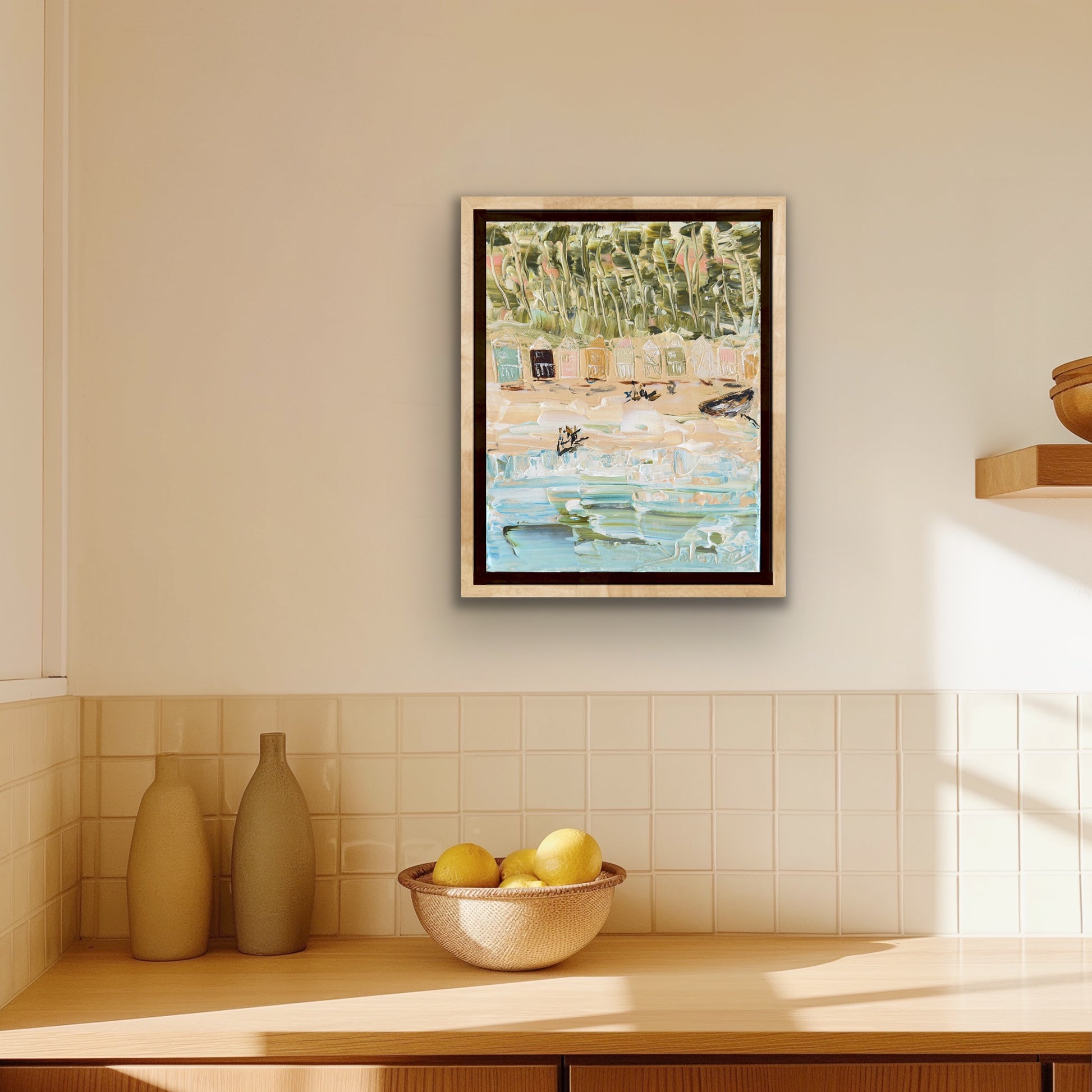 The Brighton beach boxes stand in sun-faded formation, each a keeper of summer secrets and sticky fingers full of gelato. Below, the sea shimmers in soft blues and greens—ever shifting, never forgetting.