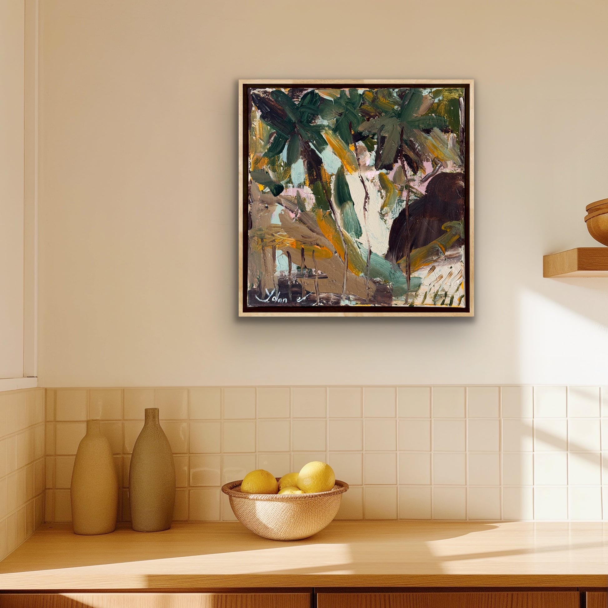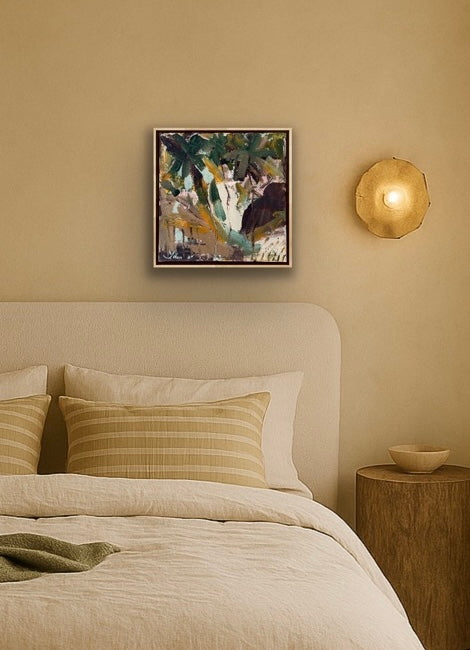 Green murmurs, ochre drifts—Palm Curtain, Tamborine Mountain moves like memory, not map. It draws the shape of something half-remembered, where the mountain blurs into light, leaf, and feeling.